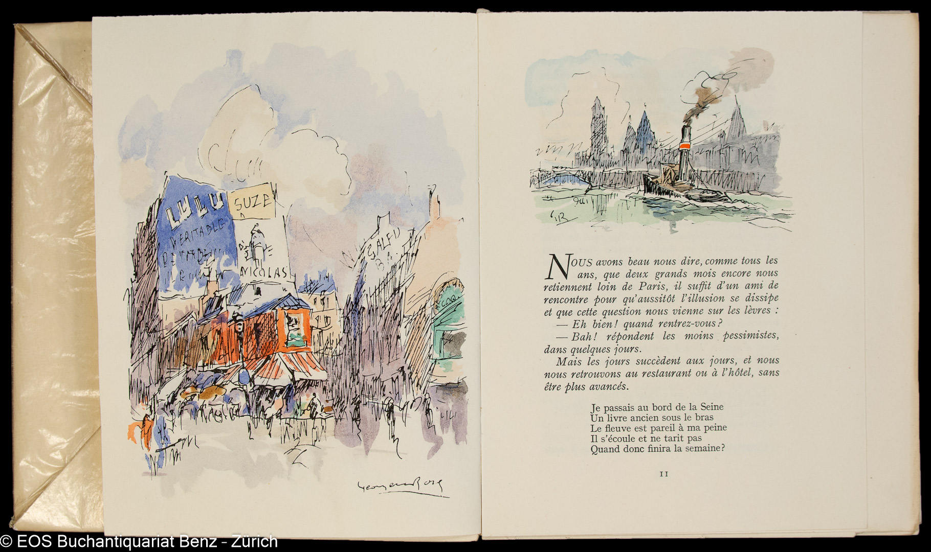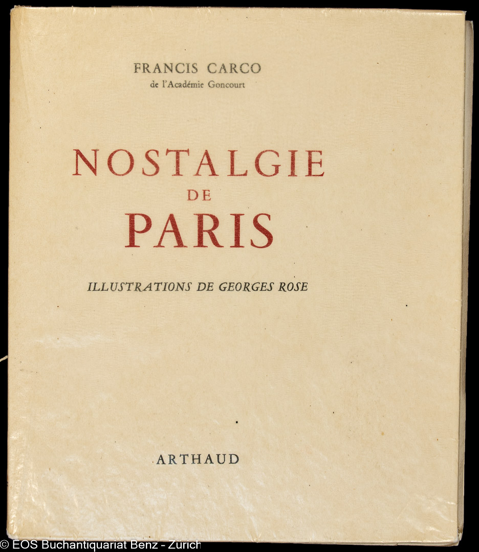 Carco, Francis (i.e. Francis Carcopino-Tusolis): Nostalgie de Paris. Illustrations de Georges Rose. Grenoble und Paris, B. Arthaud, 1946. 8°. 224, (2) S., (3) Bl. Mit farb. Illustrationen von Georges Rose. Franz. Broschur.