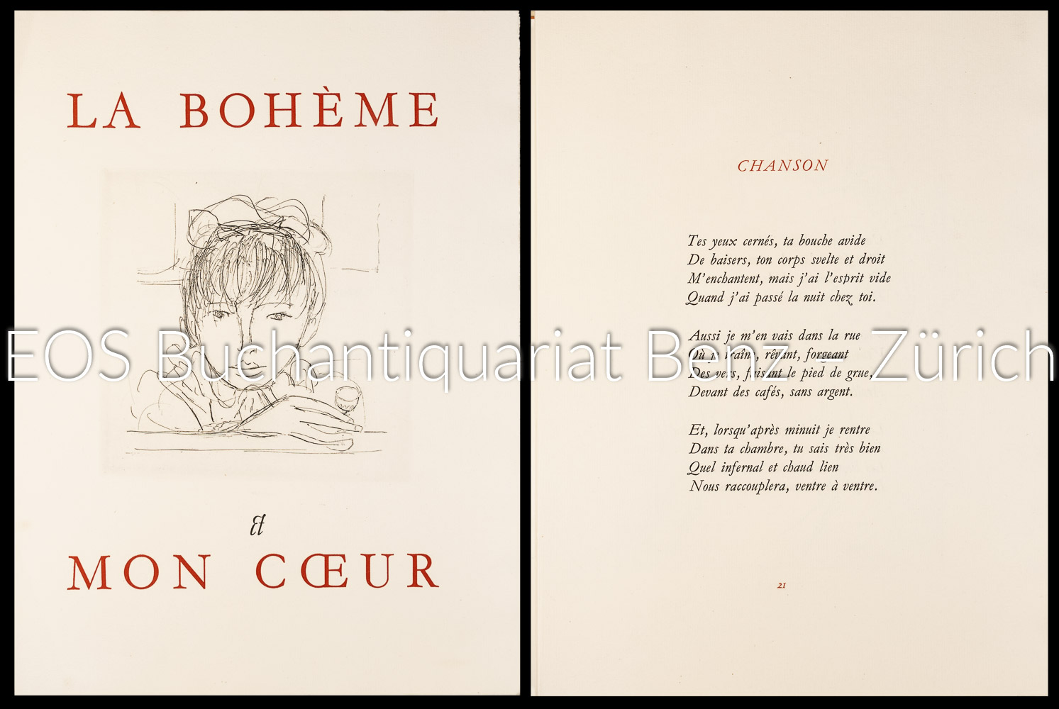 Carco, Francis:  La bohème et mon coeur. Poèmes de Francis Carco. Genève. Edition du milieu du monde, 1943. Folio (39 x 29,3 cm). 188 Seiten, 4 Blatt, 10 ganzseitige Original Radierungen von Maurice Barraud. Lose Blätter in Umschlag, Chemise und Schuber mit Rückenschild.