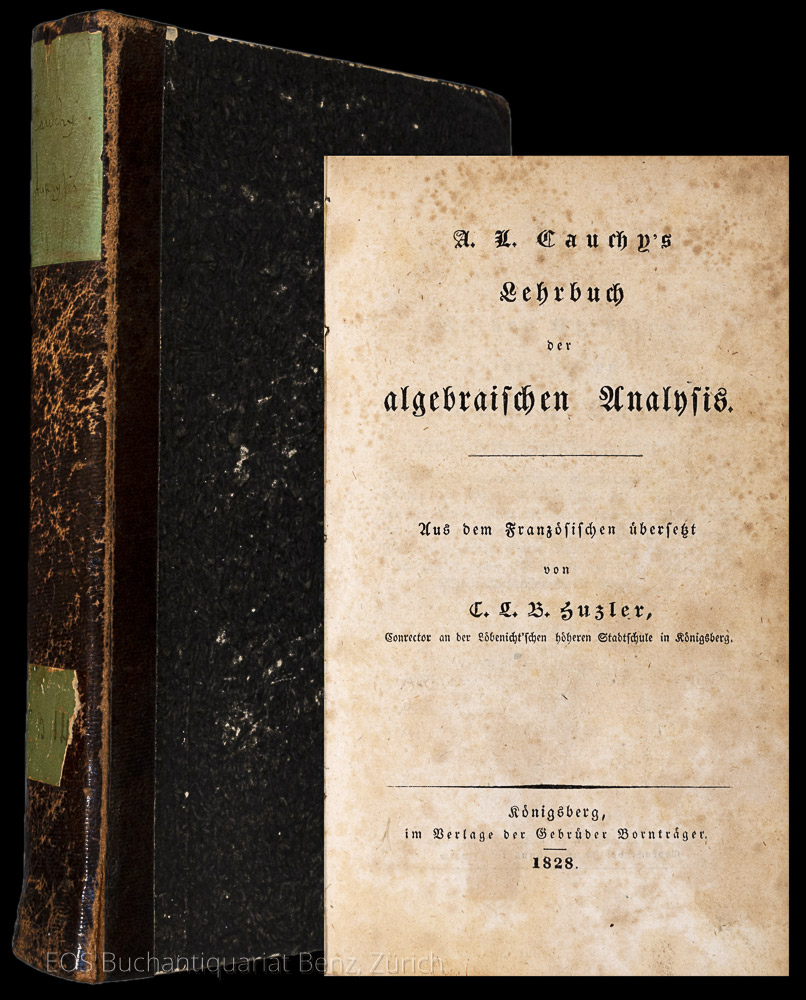 Cauchy, Augustin Louis: Lehrbuch der algebraischen Analysis. Aus dem Französischen übersetzt von C. L. B. Huzler. Königsberg, Bornträger, 1828. 8°. XVI, 416 S. Halblederband der Zeit.