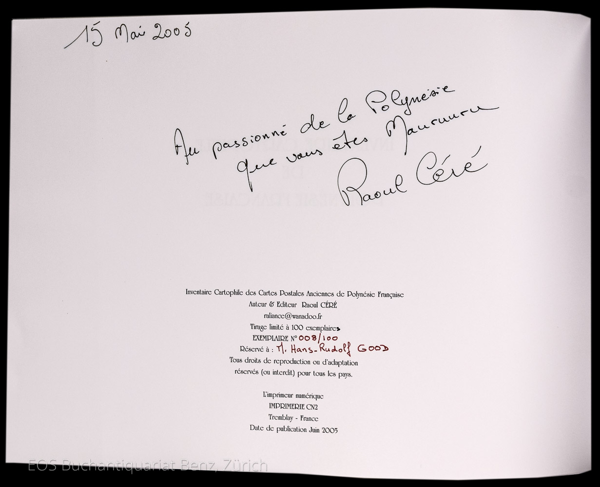 Céré, Raoul: Inventaire cartophile de Polynésie française. Cartes postales anciennes 1898–1945. France, 2005. Quer-4°. 291 S. Mit zahlr. Illustr. alter Postkarten. Illustr. Orig.-Leinenband.