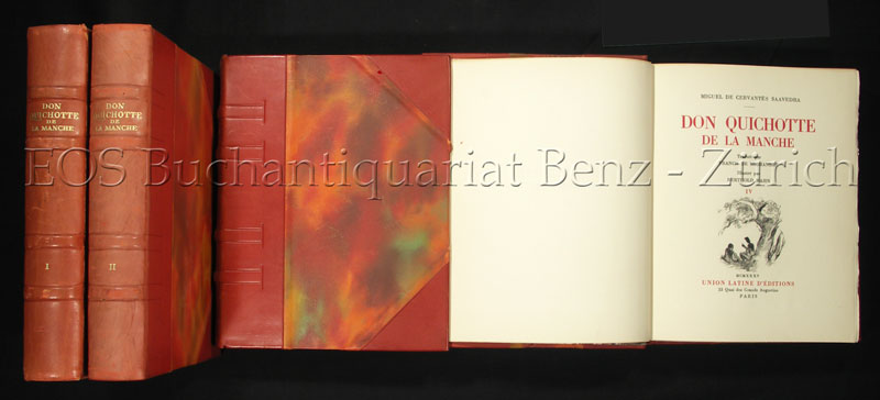 Cervantès Saavedra, Miguel de: Don Quichotte de la Manche. Traduit par Francis de Miomandre. Paris, Union Latine d’Édition, 1935. 4 Bände. 4°. Mit illustrationen von Berthold Mahn. Halblederbände der Zeit mit verg. Rückentitel.