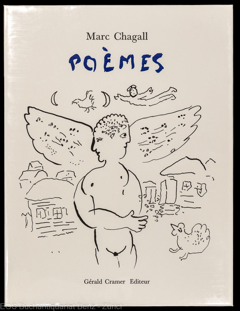Chagall, Marc: Poèmes. Genève, Cramer Éditeur, 1975. 4°. 140 Seiten mit Illustrationen und Gedichten von Marc Chagall. Halbleinenband mit Pappdeckeln und illustriertem Schutzumschlag in Pappschuber.