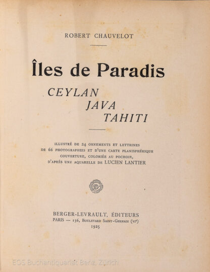 Chauvelot, Robert: Iles de paradis. Ceylan, Java, Tahiti. Paris, Berger-Levrault, 1925. 8°. 328 S. Mit zahlr. Tafeln und einer gef. Karte. Moderner Halblederband mit farb. illustr. Orig.-Umschlag (eingebunden).