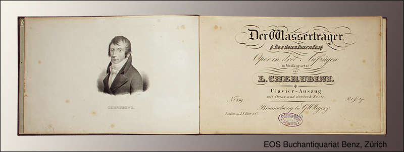 Cherubini, L(uigi): Der Wasserträger. Les deux journées. Oper in drei Aufzügen in Musik gesetzt von L. Cherubini. Clavier-Auszug mit franz. und deutsch. Texte. Braunschweig, G. Meyer, o.J. (um 1820). Kl.-quer-4°. (2) 127 S. (gestoch. Noten). Mit 1 lithogr. Portrait von Oehme & Müller. Orig.-Leinenband.