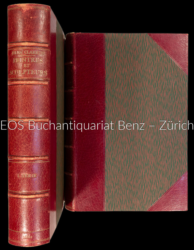 Claretie, Jules: Peintres & sculpteurs contemporains. Première Série: Artistes décedés de 1870 à 1880. (2:) Deuxième Série, Artistes vivants en janvier 1881. Paris, Libr. des Bibliophiles, 1882. 2 Bände. XV, 384 S. Portr.; (2) Bl., 391 S. Mit zahlr. Portrait-Tafeln. Halblederbände der Zeit.