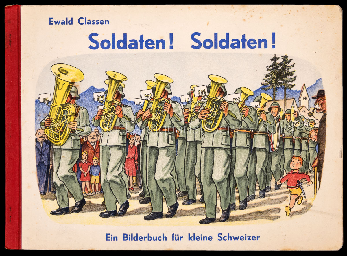 Classen, Ewald: Soldaten! Soldaten! Ein Bilderbuch für kleine Schweizer. Zürich, Neue Bücher AG. Bilderbücher-Vlg, o.J. (um 1955). Quer-4°. 10 Bl. 9 farb. Illustr. nach Ernst Huber. Farb. illustr. Orig.-Pappband.