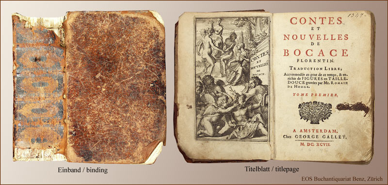 Boccacio.- Contes et nouvelles de Bocace Florentin. Traduction libre, accommodée au gout de ce temps, & enrichie de figures en taille-douce gravées par Mr. Romain de Hooge. Amsterdam, George Gallet, 1697. 2 in 1 Bd. 8°. (22) 427 S.; S. 3-427, (12) S. Mit 100 gest. Titelillustr. von Romain de Hooge u. 4 Holzschnitt-Vignetten. Lederbd. d. Zt. (berieben u. stark bestossen, Rücken mit grösseren Fehlstellen an Kopf u. Fuss).