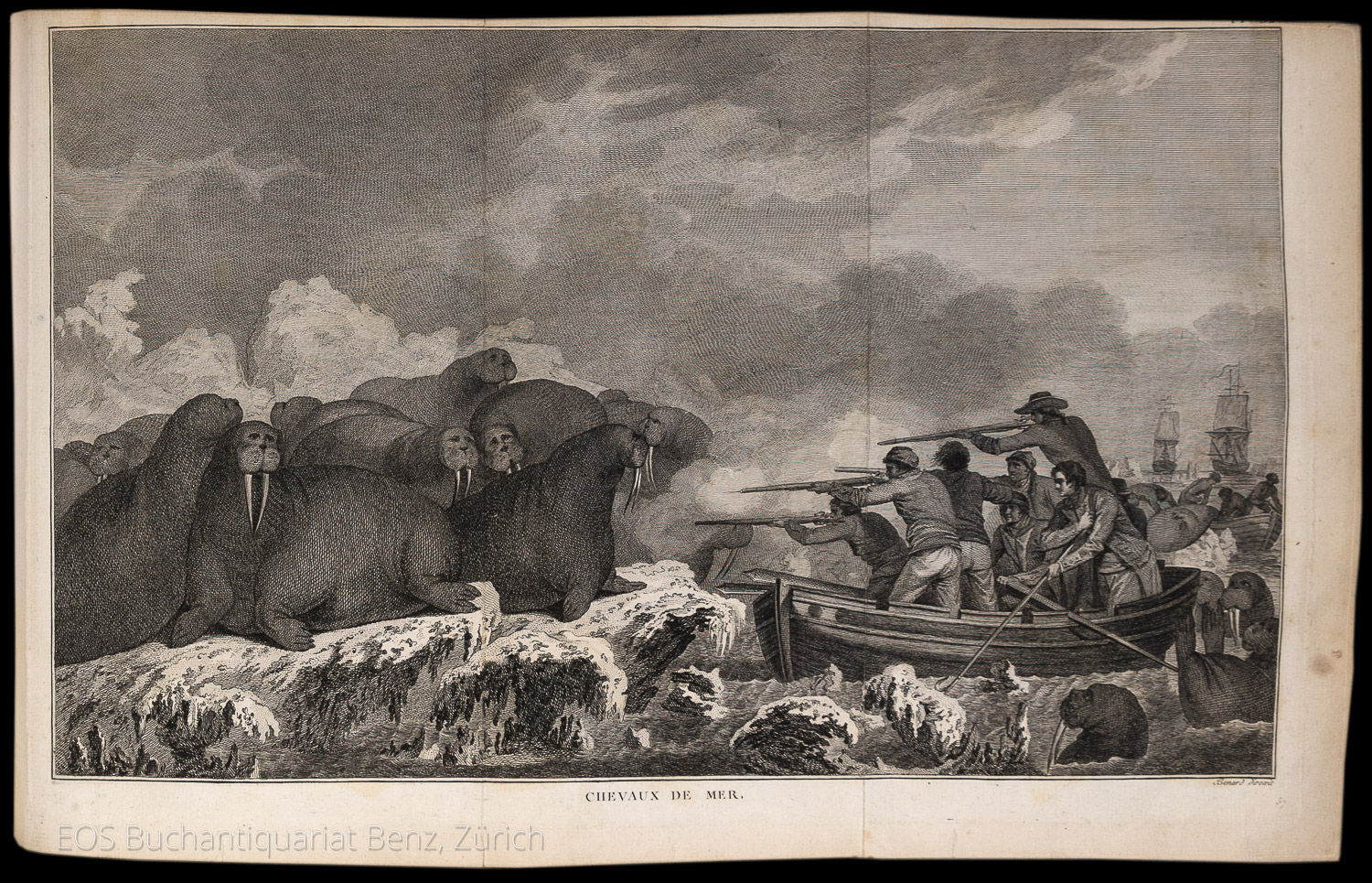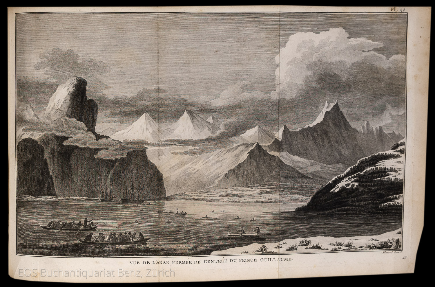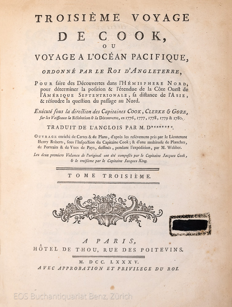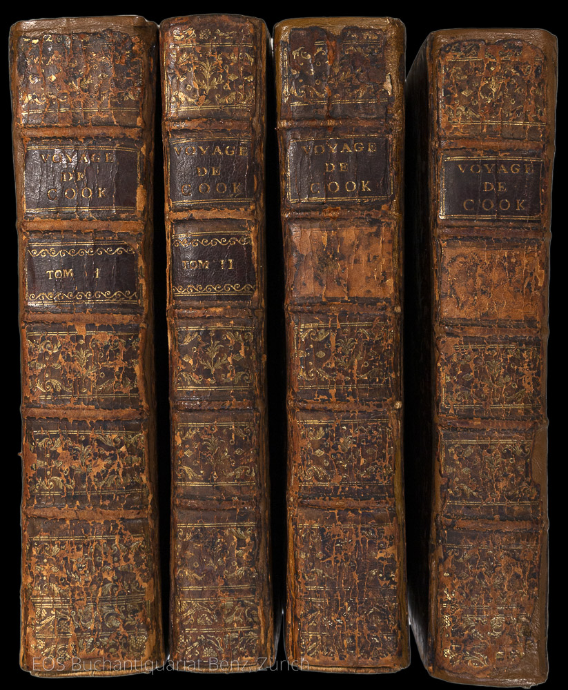 Cox I, 65. – O’Reilly / Reitman 436. – Zweiter Druck der französischen Ausgabe der dritten und letzten Reise von James Cook, die auf Hawaii mit seinem Tod endete. – Mit total 68 (davon 33 gef.) Kupfertafeln, 19 (davon 15 gef.) Kupferkarten und 1 gef. Tabelle. – Mit einigen Mängeln an den Kupfertafeln. Bei Tafel eins in Band eins fehlt ein Teil der Tafel und die Tafel bei Seite 312 mit 2 x 3 cm grosser Fehlstelle. In Band drei die gef. Tafel bei Seite 20 mit mehreren grösseren Einrissen. In Band vier fehlt bei der Tafel bei Seite 69 ein Teil des Kupfers und bei den Seiten 240 und 344 die Tafeln mit grösseren Ausrissen. Die Einbände mit restaurierten Rücken, stärker berieben und bestossen. (Sprache: Französisch / Français / French)