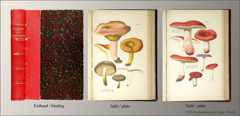 Cordier, F(rançois) S(imon): Les champignons. Histoire, description, culture, usages des espèces comestibles, vévéneuses, suspectes, employées dans les arts, l’industrie, l’économie domestique, la médecine. Paris, Rothschild, 1876. 4. Auflage. 4°. (1) Bl., 438 S., (1) Bl. Mit 60 chromolithogr. Tafeln nach Zeichnungen von A. D. Cordier. Halblederband aus der Zeit mit goldgeprägtem Rückenschild.