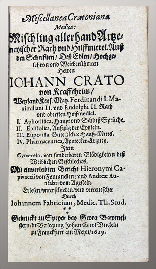 Crato, Johannes (von Krafftheim): Trias Cratoniana medica. Drey aussbündige Tractat dess … I. Microtechne, Kleine Artzneykunst. II. Methodus, Wegweiser zur Cur. III. Diaetetice Lebens: und Speiss Ordnung. Ins Teutsch gebracht durch Johann Fabricium. – (Angebunden:) |Ders.|: Miscelanea Cratoniana medica: Mischling allerhand Artzeneyischer Rath und Hilffmittel … I. Aphoristica, Haupt und Schluss Sprüche. II. Epistolica, Ausszug der Episteln. III. Euporista Gute leichte Hauss-Mittel. IV. Pharmaceutica, Apotecker-Artzney. Item(:) Gynaeceia, von sonderbaren Blödigkeiten dess Weiblichen Geschlechts. Mit einverleibten Bericht Hieronymi Capivaccii von Fantanellen und Andrae Aurifabri vom Agestein. Erlesen / unterschieden und verteutschet Durch Johann Fabricium. Frankfurt a. M., Johann Carl Unckel, 1629. 8°. 106 S., (1) Bl.; 214 (von 237) S. Pergamentband der Zeit.