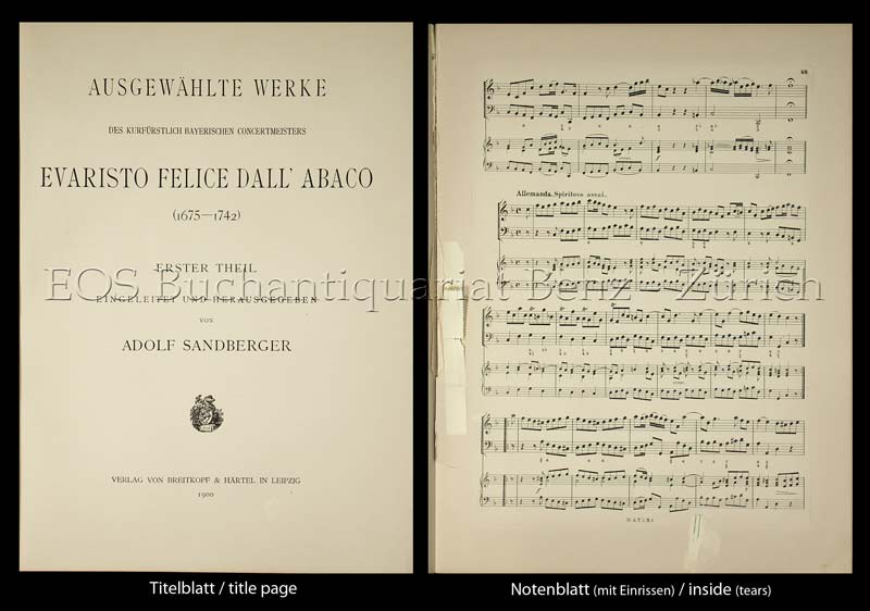 Dall’Abaco, Evaristo Felice:  Ausgewählte Werke. Des Kurfürstich bayerischen Concertmeisters Evaristo Felice Dall’Abaco. (1675-1742). Erster Theil. Eingeleitet und herausgegeben von Adolf Sandberger. Leipzig, Breitkopf & Härtel, 1900. Folio. LIX (1) S., 177 S. gestochene Noten. Halblederband der Zeit (berieben und bestossen). = „Denkmäler Deutscher Tonkunst“, Folge 2 (zugleich) „Denkmäler der Tonkunst in Bayern“ , 1. Jg.