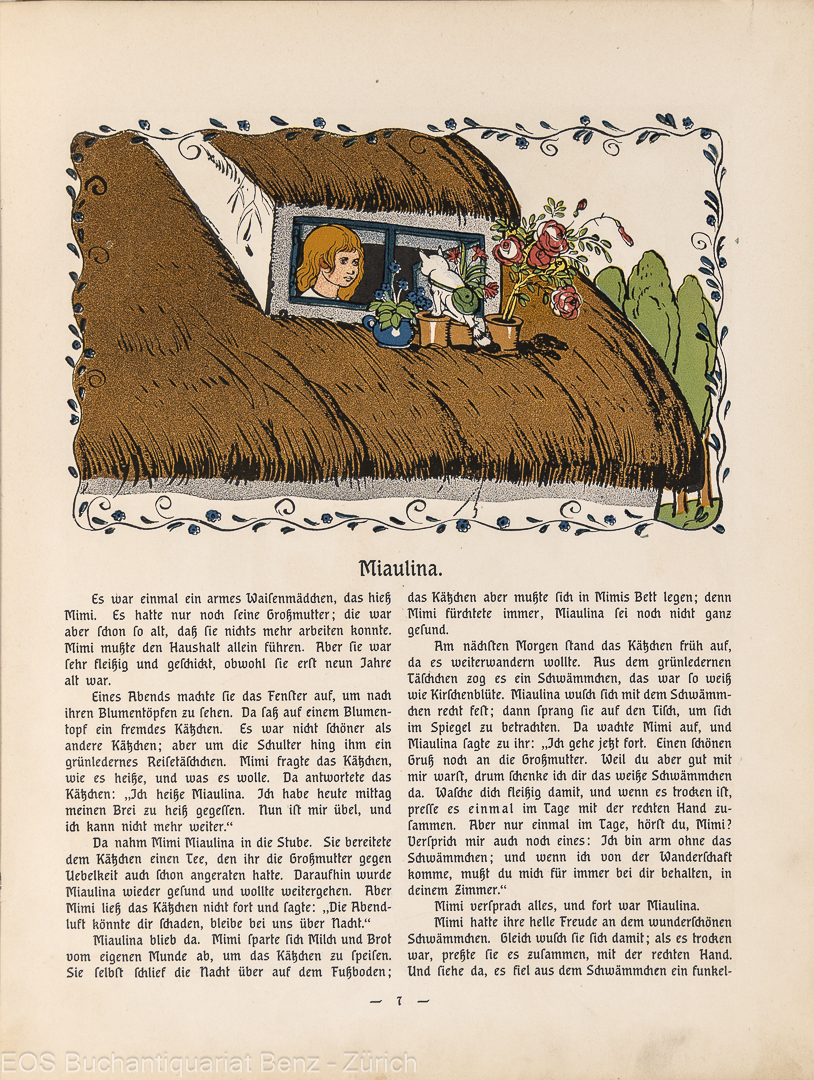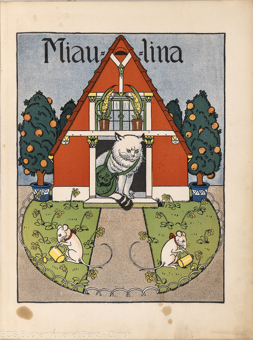 Dannheisser, Ernst: Miaulina. Ein Märchenbuch für kleine Kinder. Köln, Schaffstein, (1902). 4°. 55 S., (1) S. (Verlagsanzeigen). Mit zahlr. (dv. einige ganzs.) lithogr. Illustrationen von Julius Diez. Illustr. Orig.-Halbleinenband.