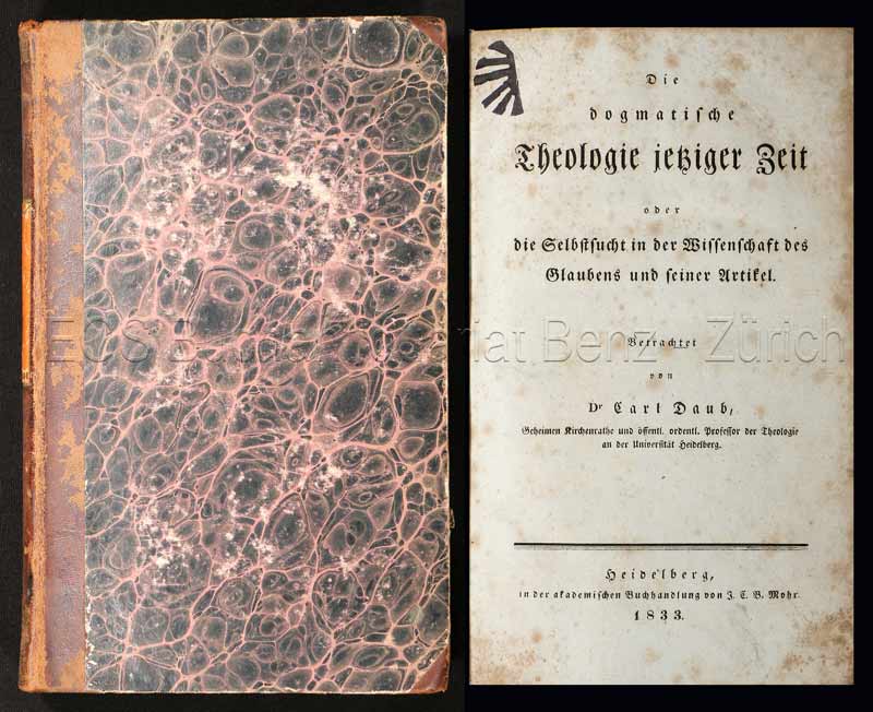 Daub, Carl: Die dogmatische Theologie jetziger Zeit oder die Selbstsucht in der Wissenschaft des Glaubens und seiner Artikel. Heidelberg, J.E.B. Mohr, 1833. 8°. XIV S., (1) Bl., 510 S. Halblederband der Zeit.