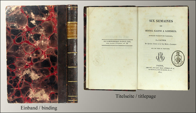 Defauconpret, A.-J.-B. (Hrsg.): Six semaines en hôtel garni à Londres. Ouvrage traduit de l‘ Anglois, par L‘ auteur de quinze jours et de six mois à Londres: avec des notes du traducteur. Paris, Gide Fils, 1817. 8°. (4) II, 369 S. Halblederbd. d. Zt. mit Rückenvergoldung (Gelenke spröde, berieben u. bestossen).
