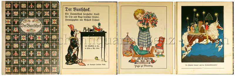 Dehmel, Richard (Hrsg.): Der Buntscheck. Ein Sammelbuch herzhafter Kunst für Ohr und Auge deutscher Kinder. Köln, Schaffstein, 1904. 4°. 56 S., (1) S. (Anzeigen). Mit 10 ganzs. Illustr. u. zahlr. Textillustr. von Ernst Kreidolf, Konrad Ferdinand Edmund von Freyhold, Karl Hofer u. Emil Rudolf Weiss. Farb. illustr. Orig.-Halbleinenbd. (berieben und bestossen, Rücken restauriert, mit einigen Flecken) – ordentliches Exemplar.