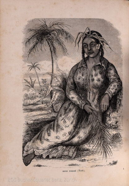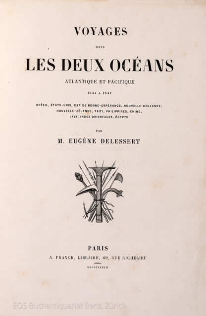Delessert, M. Eugène: Voyages dans les deux Océans, Atlantique et Pacifique. 1844 à 1847. Brésil, États-Unis, Cap de Bonne-Espérance, Nouvelle-Hollande, Nouvelle-Zélande, Taiti, Philippines, Chine, Java, Indes Orientales, Égypte. Paris, Franck, 1848. Gr.-8°. 326 S. Mit 2 gef. Karten, zahlr. Holzstichen auf Tafeln und im Text. Halblederband der Zeit.