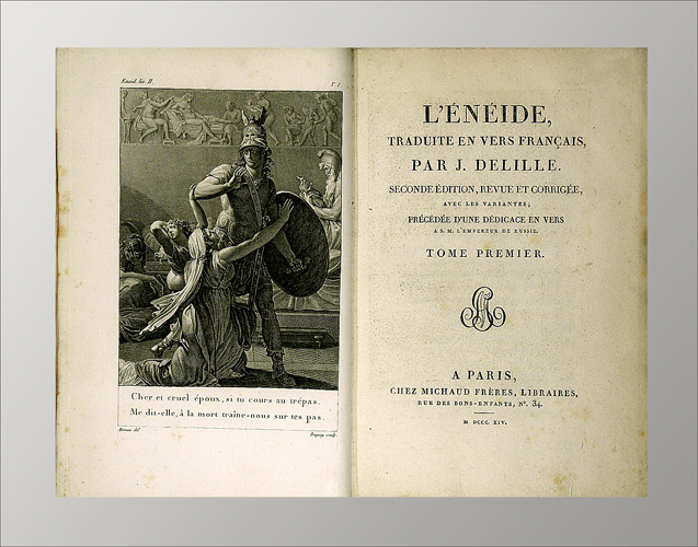 Delille, J. (nach Vergil):  L’énéide, traduite en vers français. Seconde édition, revue et corrigée, aves les cariantes. Précédée d’une dédicace en vers A. S. M. l’empereur de Russie. Paris, Michaud Frères, 1813-1814. 2. Auflage. 12 in 4 Bde. 8°. Mit 4 gest. Frontispiece von Baquoy u. Simonet nach Moreau. Haldlederbde. d. Zt. mit einfacher Deckel- u. Rückenfiletierung (bestossen, Rücken verblasst).