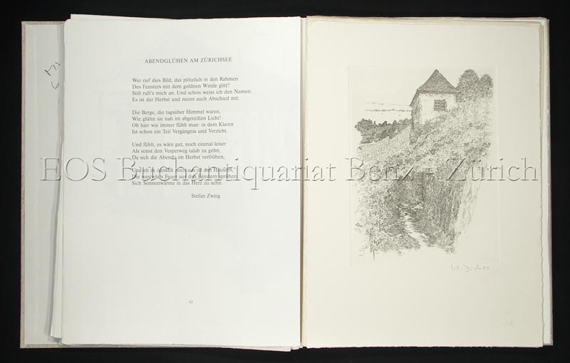 Der ganze Zürichsee vor meinen Füssen. Zeichnungen und Radierungen von Walter Dick. Texte aus drei Jahrhunderten ausgewählt von Herbert E. Stüssi. Tufertschwil, Edition Fäderehalter, 1987. 4°. (8), 129 (2) S. Mit 7 signierten Radierungen und 20 (davon 7 doppels. und 11 ganzs.) Textillustrationen von Walter Dick. Lose Lagen in Orig.-Leinenmappe und Pappschuber.