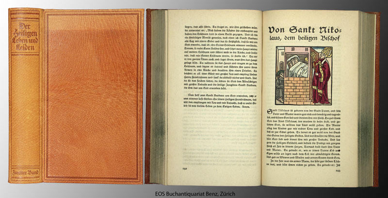 Der Heiligen Leben und Leiden anders genannt das Passional. Erster Band: Wintertheil. Zweiter Band: Sommerteil. Leipzig, Insel, 1913. 2 Bde. 8°. (1) Bl., (4) 445 (3) S., (1) Bl.; (1) Bl., (4) 511 (1) S., (1) Bl. Mit zahlr. handkol. Holzschnitten nach alten Vorlagen. Lederband der Zeit (leicht berieben und bestossen).