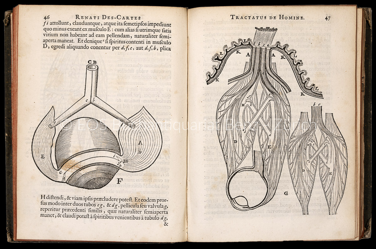 Descartes, René: Tractatus de homine, et de formatione foetus. Quorum prior notis perpetuis Ludovici de la Forge… illustratur. Amsterdam, Daniel Elsevier, 1677. Kl.-4°. (38) Bl., Titel in Rot und Schwarz mit dem Minerva-Druckerzeichen, 239 S. Mit 53 Holzschnitten (teilw. wiederholt). Späterer Pappband.