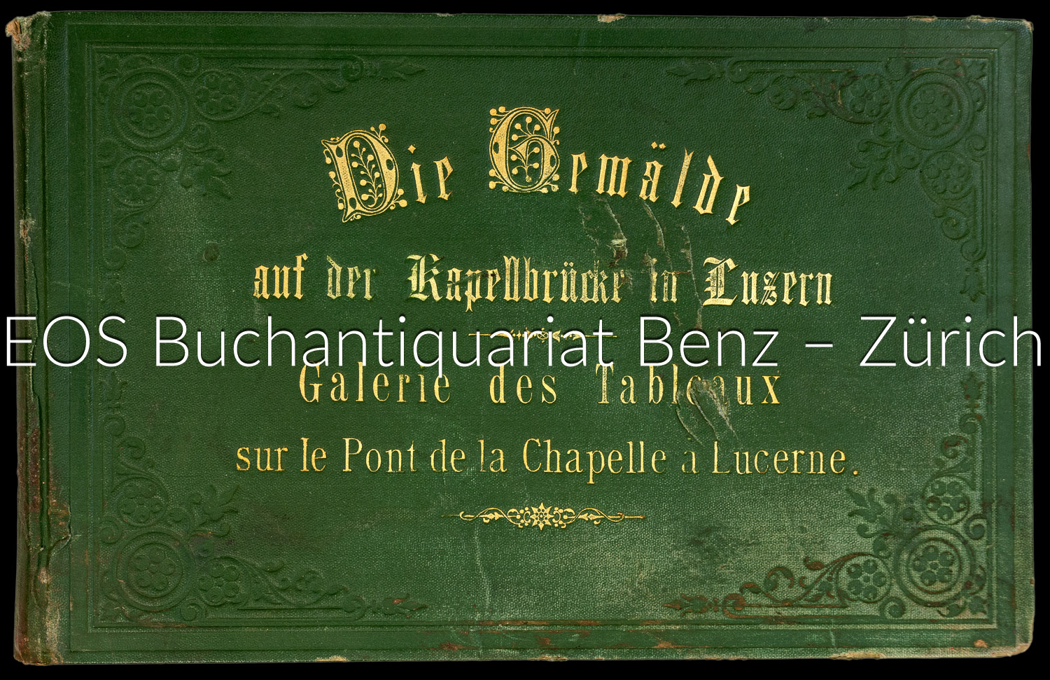 Die Gemälde auf der Kapellbrücke in Luzern. in Lichtdruck ausgeführt von Sunnberg & Rüttger in Luzern. – Galerie Des Tableaux Sur Le Pont De La Chapelle À Lucerne – The Pictures on the Chapel-Bridge of Lucerne. Luzern, Synnberg & Rüttger, 1889. Bilder in Dreiecksform: 15,3 x 22,5 cm. 1 Album (6) Bl. Mit 74 Tafeln. Grüner Orig.-Leinenband mit verg. Deckeltitel.