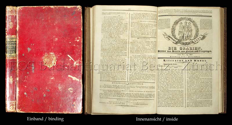 Die Grazien. Blätter aus Baiern zum Nutzen und Vergnügen. München, 1824. Folio. (6) 320, (4) S. (Register). Roter Maroquin der Zeit mit Rückenschild, Rücken-, Deckel-, Innen-, Aussen- und Stehkantenvergoldung sowie einem Wappensupralibros