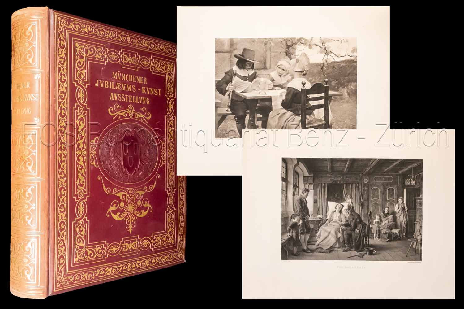 Die Malerei auf der Münchner Jubiläums-Kunst-Ausstellung 1888. (München, F. Hansstaengl), 1888. Gr.-4°. X, 180 S., (2) S. (Künstlerverzeichnis). Mit 90 Tafeln und zahlr. Illustrationen im Text (Heliogravuren). Goldgeprägter Orig.-Lederband in Schuber.