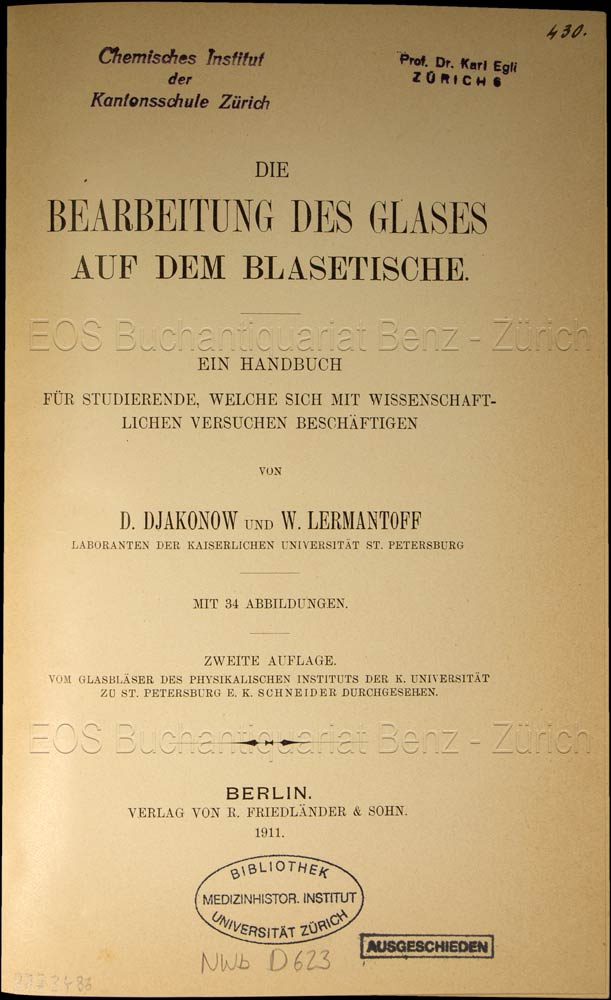 Djakonov, D(mitrij I.):  Die Bearbeitung des Glases auf dem Blasetische. ein Handbuch für Studierende, welche sich mit wissenschaftlichen Versuchen beschäftigen. Berlin, Friedländer, 1911. 2. Aufl. 8°. XV, 196 S. Mit zahlr. Textillustr. Leinenband.