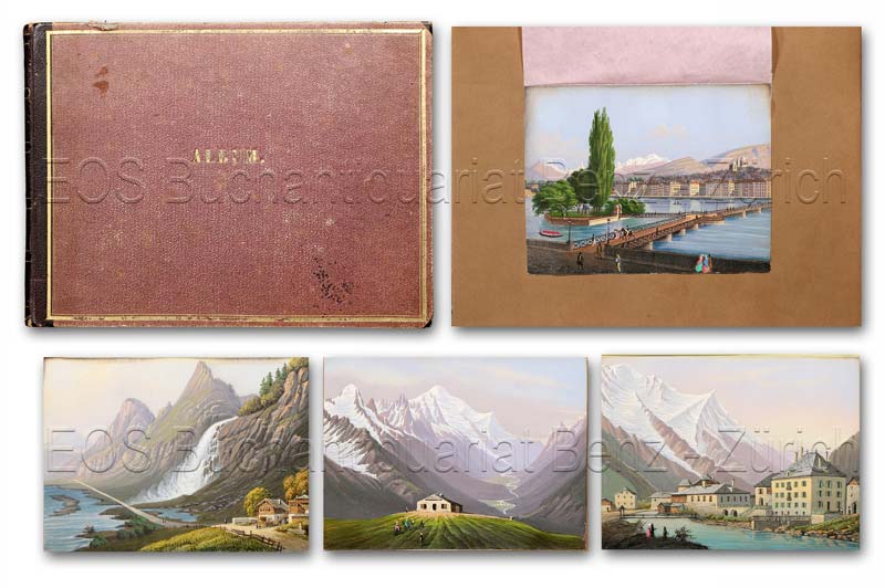 Dubois, Jean: Album. (Um 1840). Quer-4°. Mit 13 lith. Ansichten, handkoloriert (ca. 8,5 x 11,5 cm), ausgeschnitten und montiert. Halblederband der Zeit mit Goldfileten und goldgepr. Titel «Album».