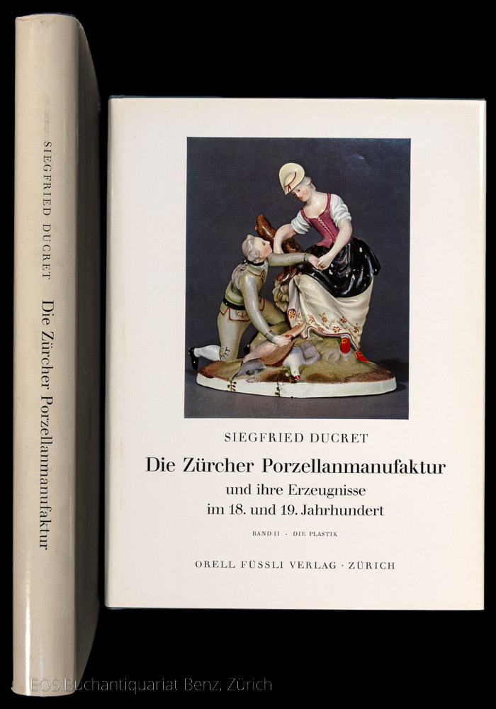 Ducret, Siegfried: Die Zürcher Porzellanmanufaktur und ihre Erzeugnisse im 18. und 19. Jahrhundert. Band I: Geschirre. Band II: Die Plastik. Zürich, Orell Füssli, 1958. 2 Bde. Lex.-8°. 322 S.; 328 S. Mit zahlr. Abb. u. 13 farb. Tafeln. Orig.-Leinenbände mit Schutzumschlägen und Pappschuber.