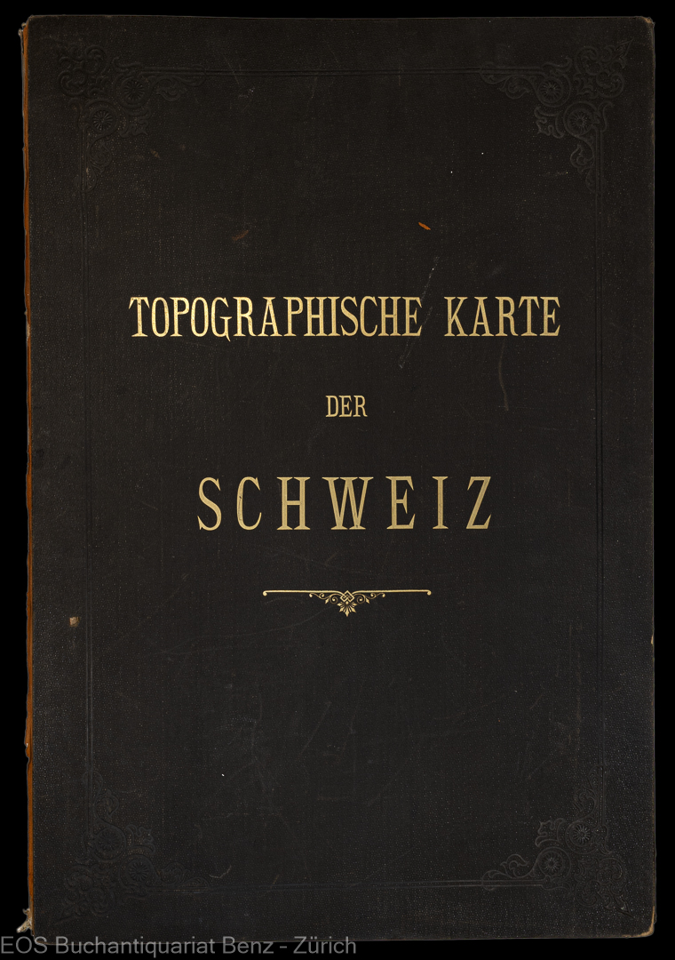 Dufour, Guillaume-Henry: Topographische Karte der Schweiz. Vermessen und herausgegeben auf Befehl der eidgenössischen Behörden. Bern, ca. 1890. Gr.-folio. Titeblatt, 24 lithographierte Karten. Es fehlt das Übersichtsblatt. Blind- und goldgeprägter Leinenband der Zeit (Rücken fehlt).