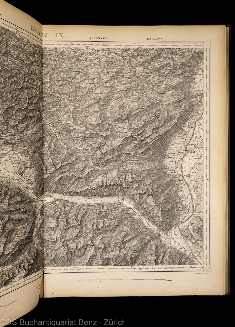 E-HLS. – Ausgabe mit dem Titelblatt der ersten Ausgabe von 1833-1863. – «1831 wurde Guillaume-Henry Dufour (1787–1875) zum Chef der Generalstabsabteilung ernannt. Er hatte somit den Auftrag, im Falle eines Krieges in Europa die Verteidigung der Schweiz zu organisieren. Im folgenden Jahr wurde er zum Oberstquartiermeister der Eidgenossenschaft (Generalstabschef) ernannt. In dieser Eigenschaft nahm er an den Tagsatzungen teil und leitete die Triangulationen für die Erstellung einer Karte der Schweiz im Massstab 1:100’000. Die Arbeiten für die sog. Dufour-Karte begannen 1832 und wurden 1864 beendet» (e-HLS). Einige Karten als Erstdruck. Die meisten mit Nachträgen bis 1886. – Leichte Gebrauchsspuren. Einband ohne Rücken. (Sprache: Deutsch / German)