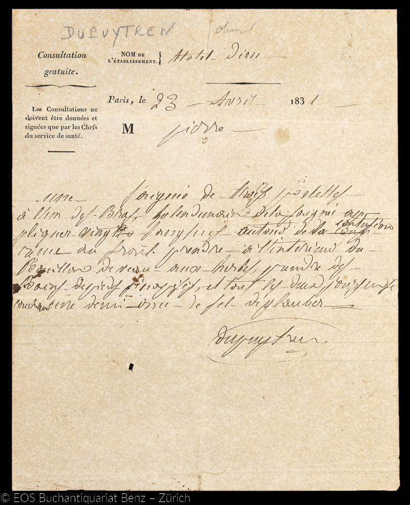 Dupuytren, Guillaume:  Handschr. Brief. – 7 Zeilen. Paris, 23. April 1831. A5.