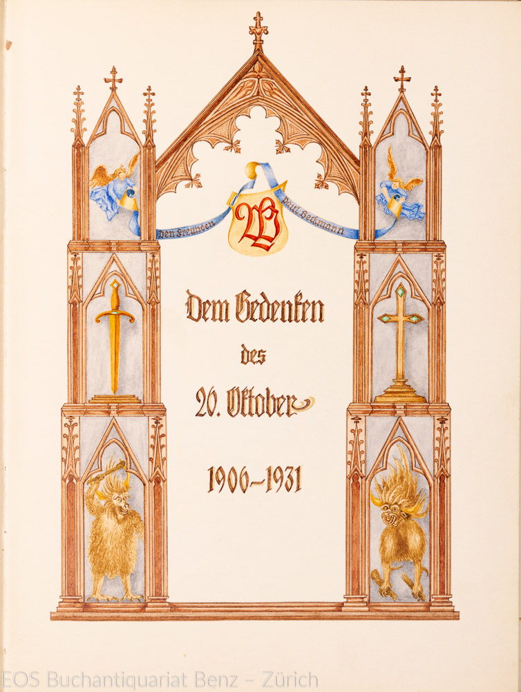 Eckertz, Waldemar: Lotte zugeignet. 1931. 66 Seiten handschr. Text mit Tuschzeichnungen und farb. gestaltetem Titelblatt von Waldemar Eckertz (1878–1947). Gebunden in Stoffband.