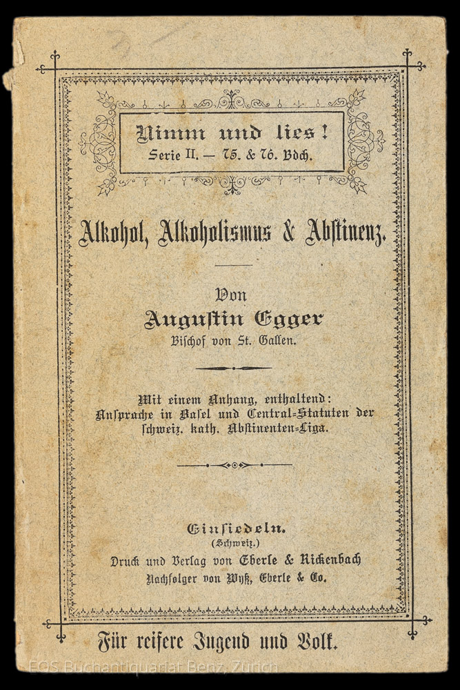 Egger, Augustin:  Alkohol, Alkoholismus & Abstinenz. Für reifere Jugend und Volk. Einsiedeln, Eberle & Rickenbach, um 1890. Kl.-8°. 128 S. Orig.-Broschur.