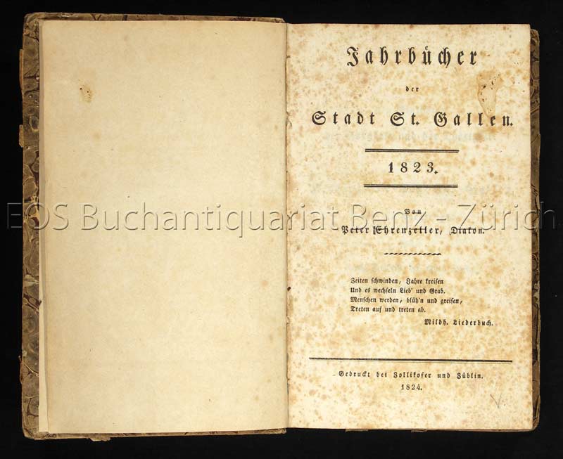 Ehrenzeller, Peter: Jahrbücher der Stadt St. Gallen. 1823-1827. (St. Gallen), Zollikofer und Züblin, Wegelin und Rätzer, 1824-28. 8°. Marmor. Pappband der Zeit mit handschr. Rückenschild.