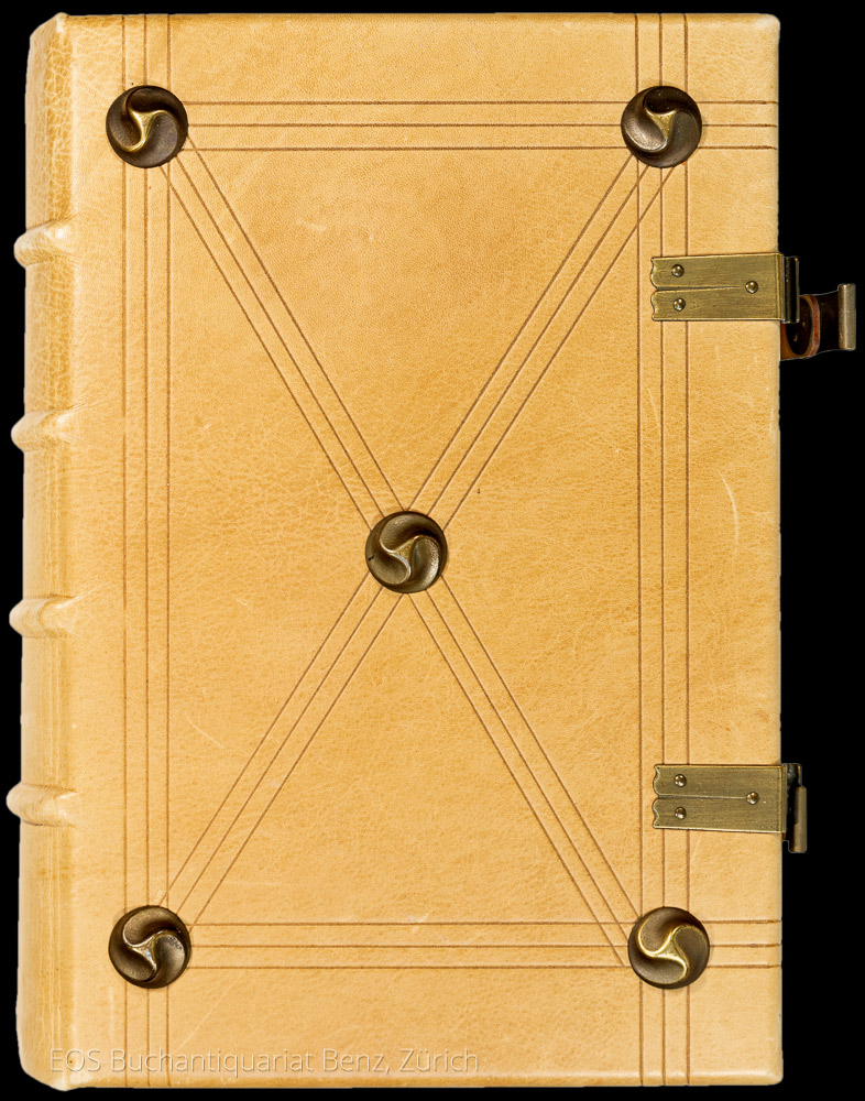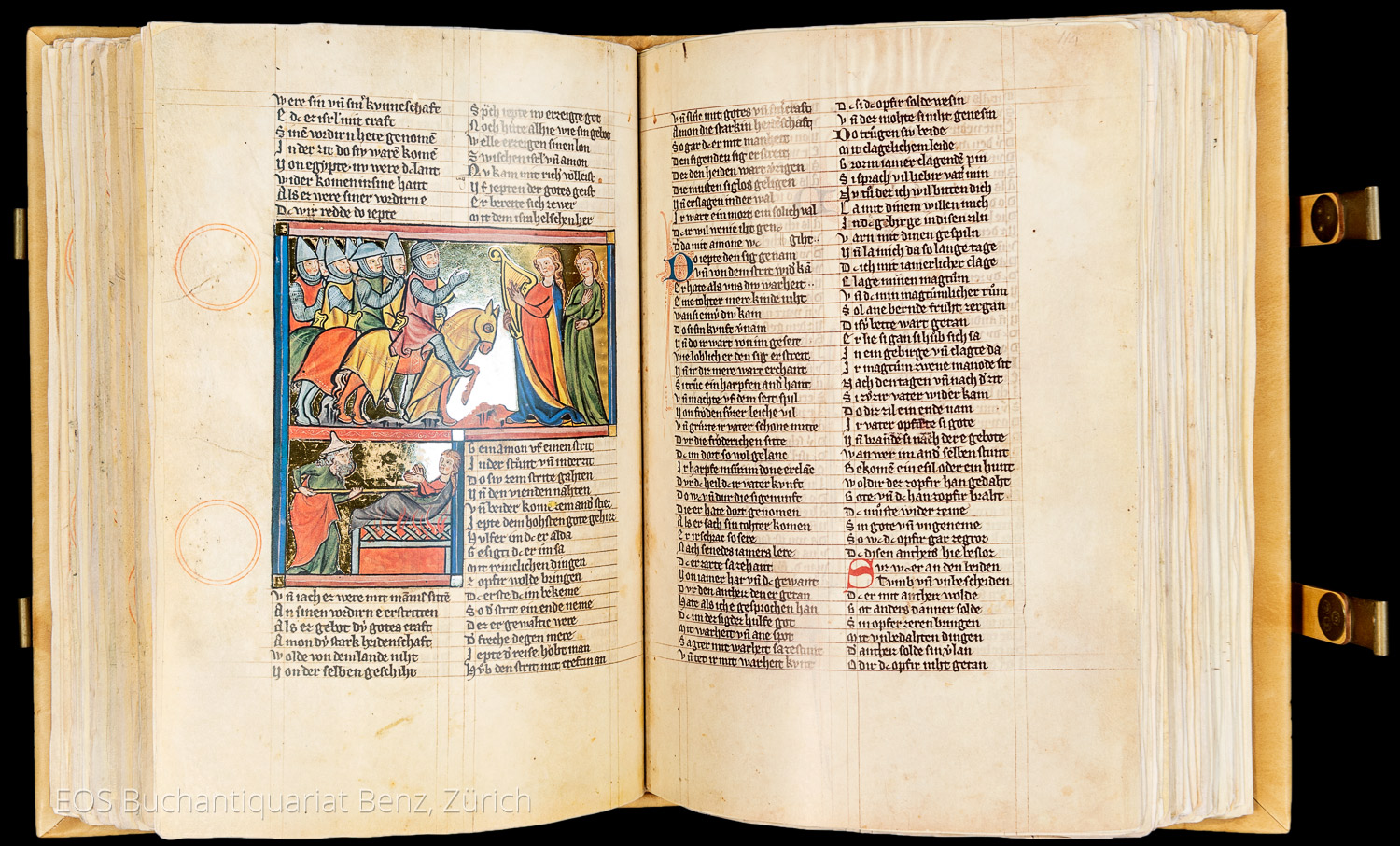 Ems, Rudolf von:  Weltchronik. Der Stricker: Karl der Grosse. Luzern, Faksimile-Verlag, 1982. 4°. 214 faksimil. Bl.; 76 faksimil Bl. Mit farb. Illustr. auf Goldgrund nach Miniaturen u. farb. Initialen. Dem Orig.-Einband entsprechender Lederbd. über Holzdeckeln mit 10 Metallbuckel-Beschlägen u. 2 Metall-Lederschliessen.