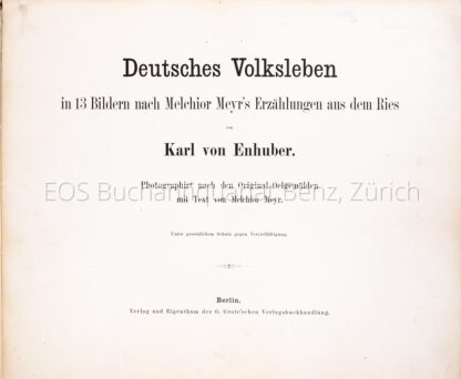 Enhuber, Karl von: Deutsches Volksleben in 13 Bildern nach Melchior Meyr’s Erzählungen aus dem Ries. Berlin, G. Grote’schen Verlagsbuchhandlung 1869. Folio. (3) Bl. Mit 13 Tafeln. Loseblattsammlung in Org.-Leinenmappe.