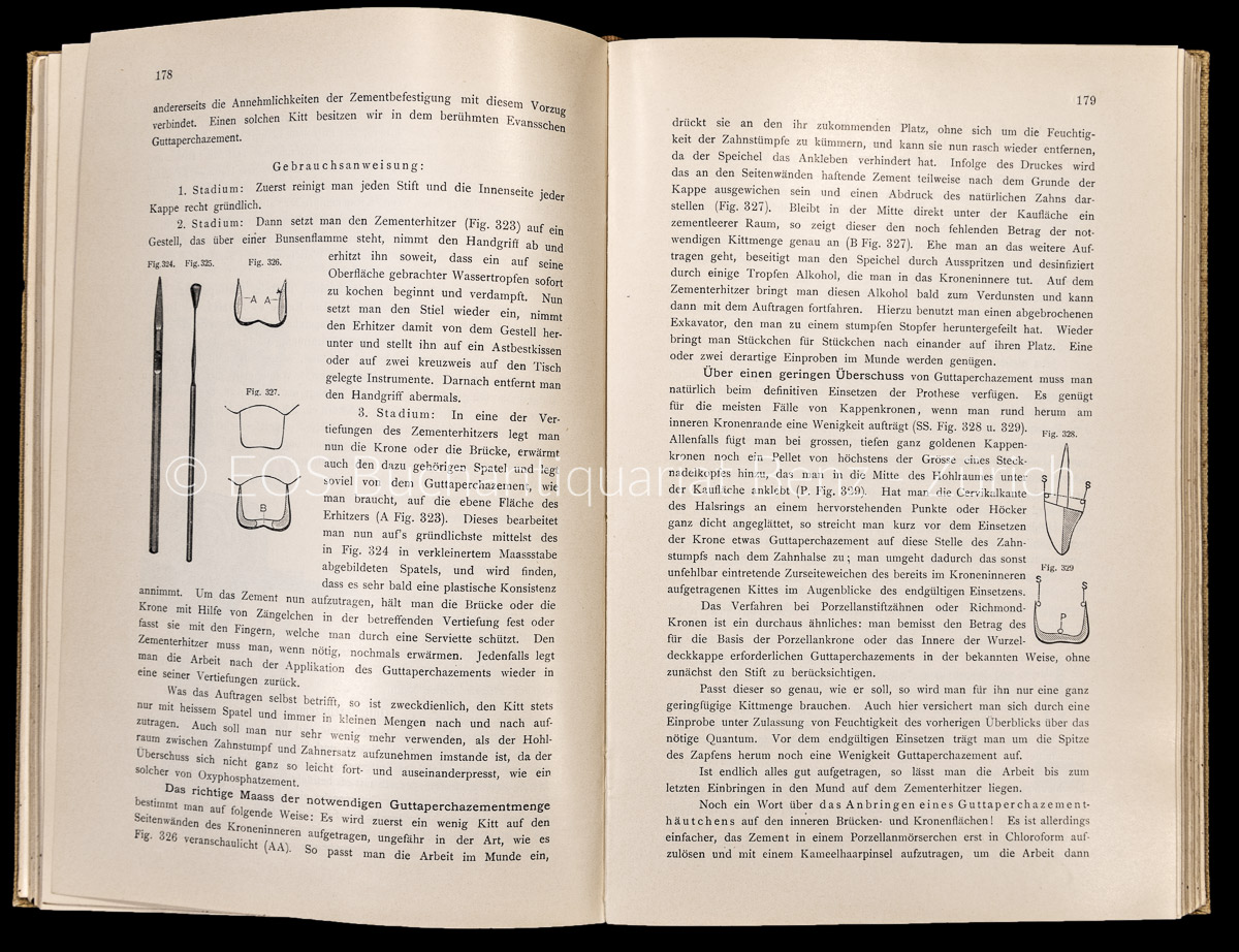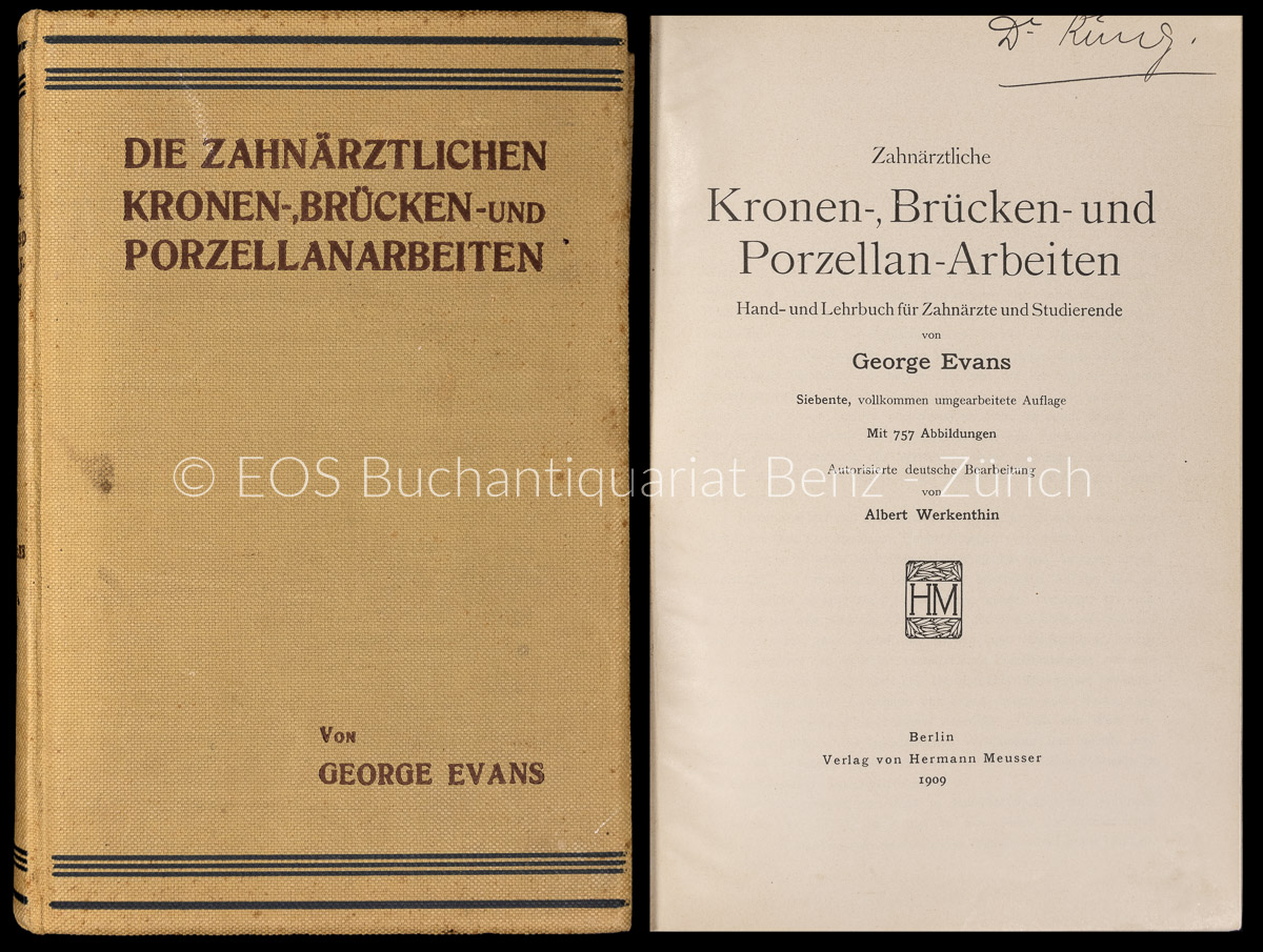 Evans, George: Zahnärztliche Kronen-, Brücken- und Porzellan-Arbeiten. Hand- und Lehrbuch für Zahnärzte und Studierende. Berlin, Hermann Meusser, 1909. 8°. 416 S. Mit 757 Illustr. im Text. Orig.-Leinenband.