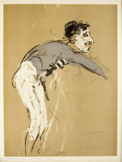 Marceau. – Falk, Hans: Hans Falk zeichnet Marcel Marceau. Zürich, Alpha-Presse, 1959. Gross-folio. (10) Bl. Mit 4 signierten Lithografien und eine handkolorierte Reproduktion von Hans Falk. Farb. Orig.-Pappumschlag (auf Stein gezeichnet).