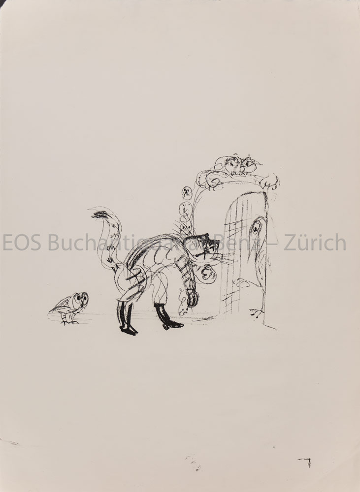 Fischer, Hans (1909–1958): Der gestiefelte Kater. Lithographie. 1957. Bildausschnitt: 14 x 16 cm.