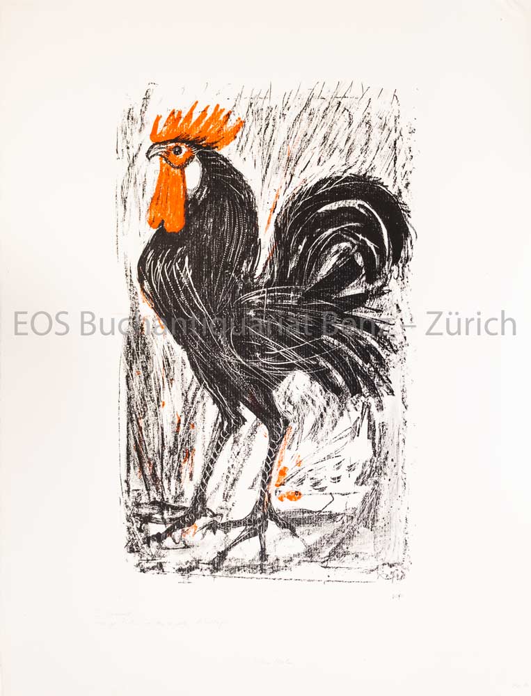 Scheidegger 164. – 2. Zustand, Hahnkörper mit weissen eingekratzten Linien. Vom Künstler bezeichnet «II. Zustand, einzige Probe vor der 4 farb. Auflage – Stolzer Hahn».