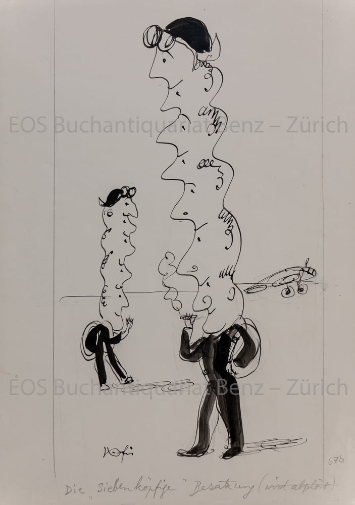 Fischer, Hans (1909–1958): Die „siebenköpfige“ Besatzung. Tuschzeichnung. Blattgrösse: 29,6 x 21 cm.