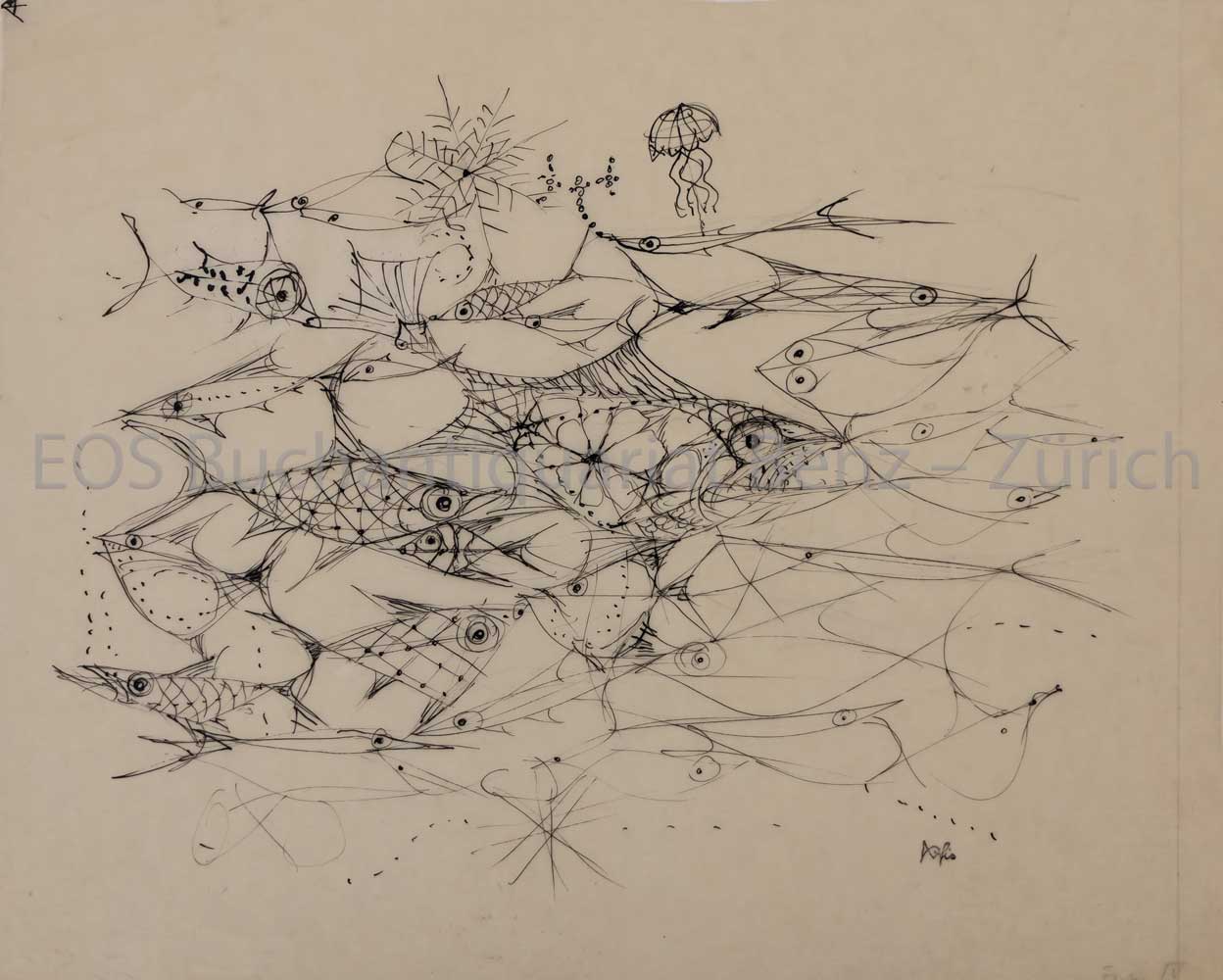 Fischer, Hans (1909–1958): Fische. Tuschzeichnung auf Pergamin. Blattgrösse: 28,4 x 35 cm