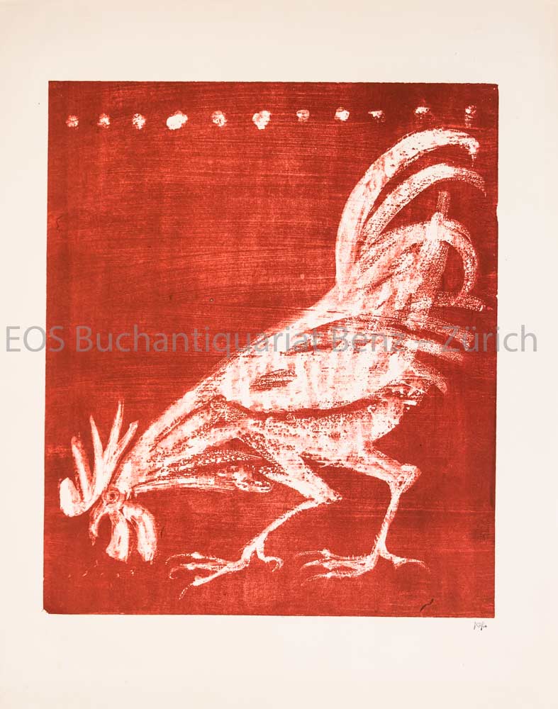 Fischer, Hans (1909–1958): Pickender Hahn. Pinsellithographie. 1957. Biildausschnitt: 41,5 x 35,5 cm.