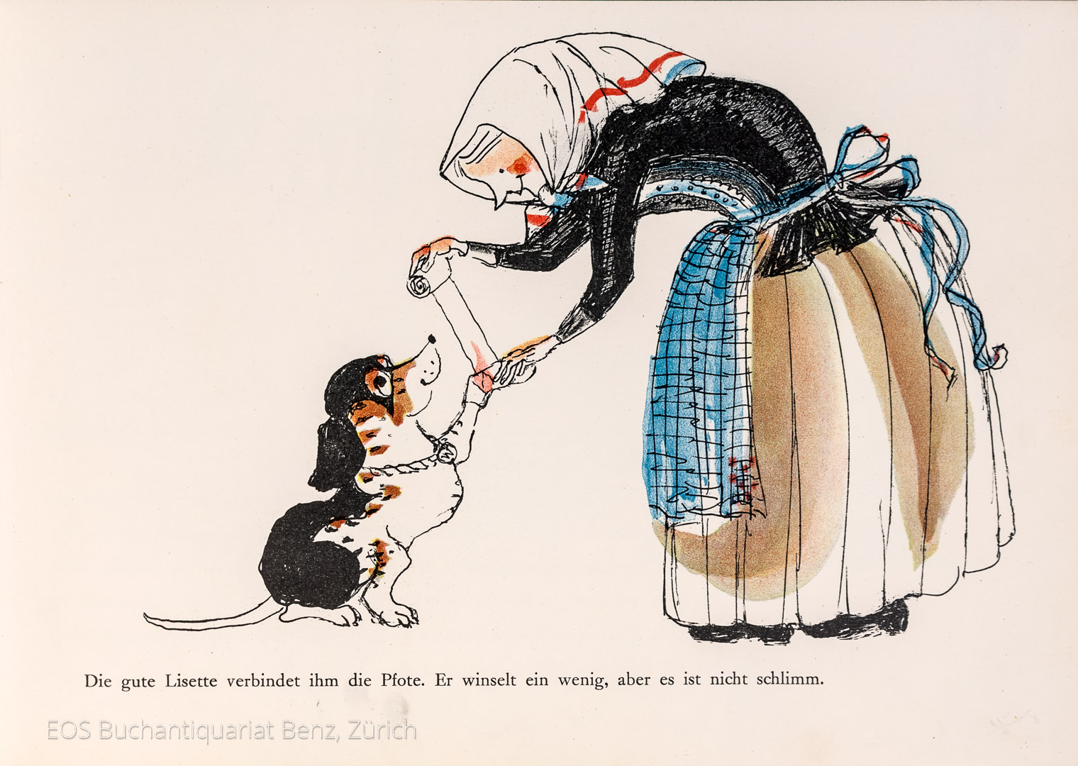 Fischer, Hans: Der Geburtstag. Eine lustige Geschichte mit vielen Bildern. Zürich, Büchergilde Gutenberg, 1947. Quer-4°. (32) S. Mit zahlr. zum Teil ganzs. farb. Textillustr. von Hans Fischer. Farb. illustr. Orig.-Halbleinenband.