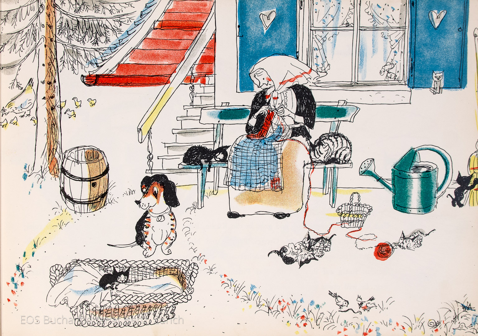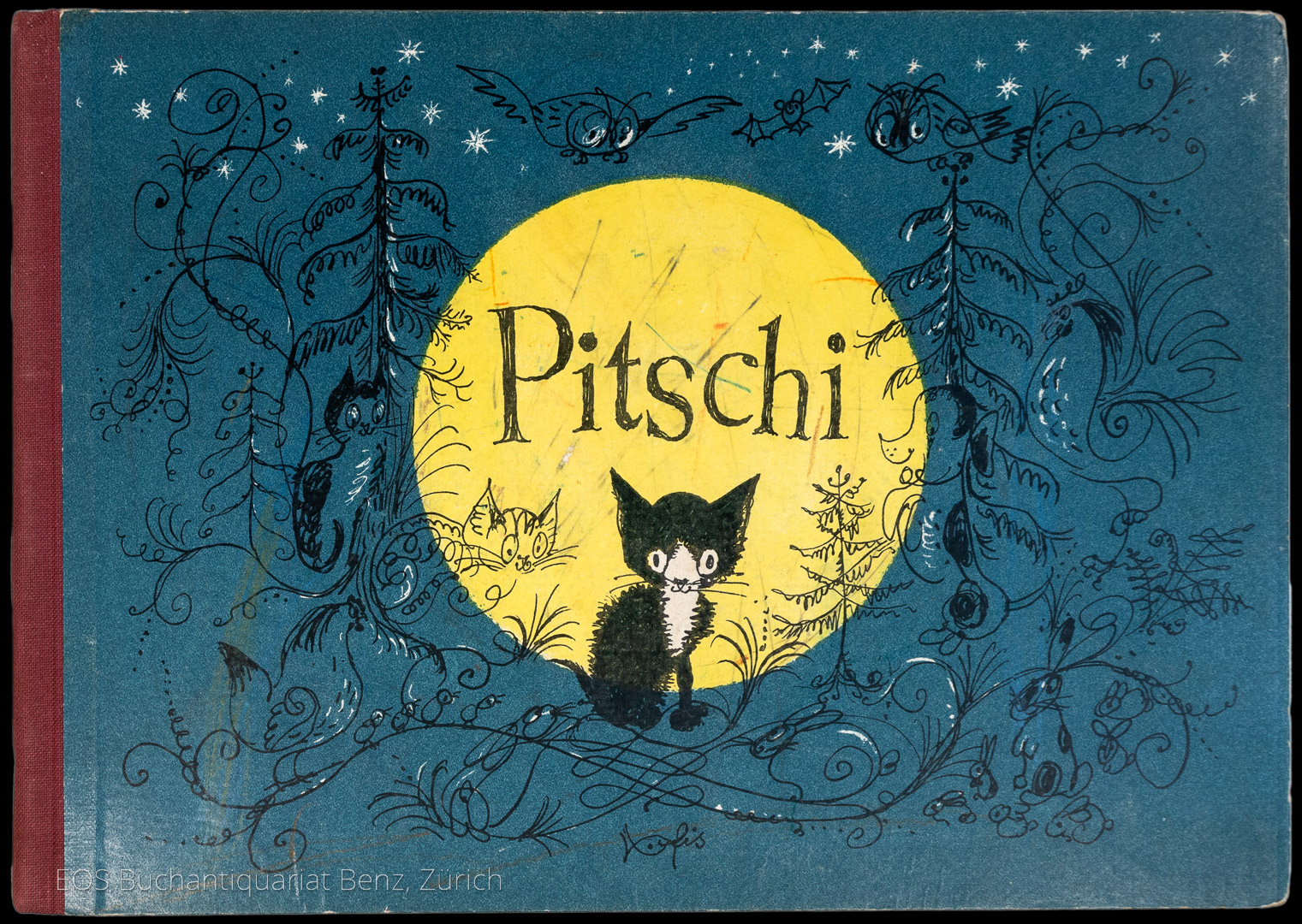 Muck 4838. – Doderer I, 388. – Schug 780. – Erstausgabe. „Zu den Wünschen seiner kleinen Tochter entstandenen Bilderfolgen“ erhielt Hans Fischer, auch fis genannt für dieses (hausgemachte) Bilderbuch kurz nach dessen Erscheinen 1948 den Schweizer Jugendbuchpreis. Hans Fischer (1909-1958), Schweizer Graphiker und Illustrator war ein Meister der Tierzeichnung. „In seinen Bilderbuchillustrationen, zunächst nur den eigenen Kindern zugedacht, zeigt F. einen resultierenden virtuosen Zeichenstil“ (Doderer). – Gebrauchsspuren, Hinterer Deckel mit kleiner Schadstelle. Résumé: With illustrations by Hans Fischer. Illustr. orig. half cloth. First edition of this classic Swiss childern book. Story and pictures by Hans Fischer, tells about a young cat called „Pitschi“.