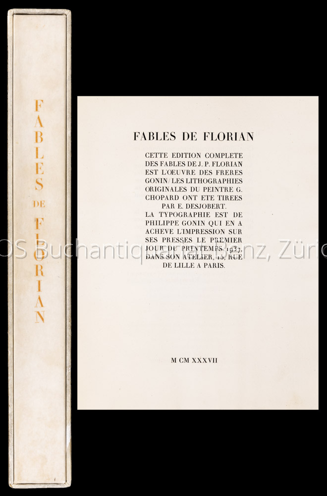 Florian:  Fables de Florian… Lithographies originales du peintre G. Chopard… tireÌes par E. Desjobert… Typographie… de P. Gonin. Paris, Gonin, 1937. 4°. 152, (4) S. Mit Lithografien im Text von G. Chopard. Lose Bögen in Chemise und Orig.-Pappdeckeln in Schuber.