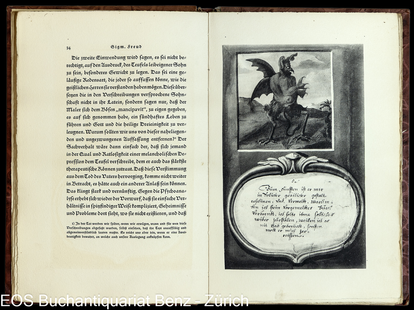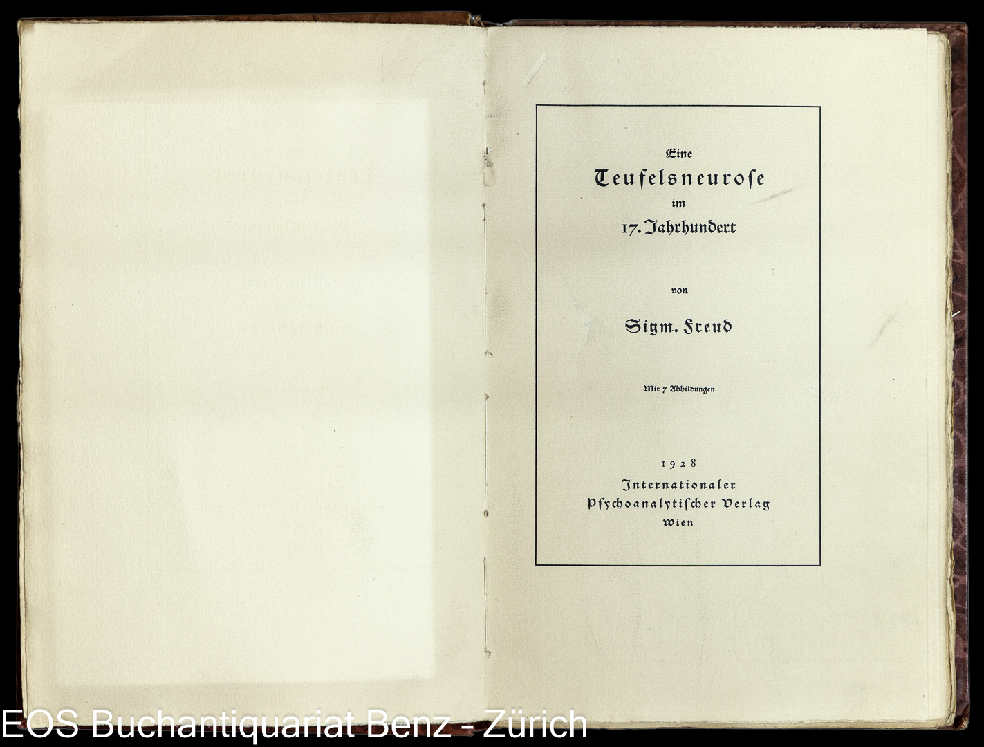 Freud, Sigmund: Eine Teufelsneurose im 17. Jahrhundert. Wien, Internat. Psychoanalytischer Verl., 1928. 1 Band und 1 Heft. Quart. 85 S., Mit 7 Abb. Pappband der Zeit.