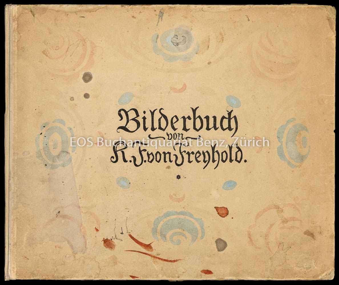 Freyhold, Karl F. Edmund von:  Bilderbuch – Band: Tiere. Köln am Rhein, H. & F. Schaffstein, (ca. 1910) 2. Auflage. Quer-4°. Kol. Titelblatt und 12 handkolorierte Tafeln. Orig.-Halbleinenband, Deckel mit farbigem floralem Dekor.